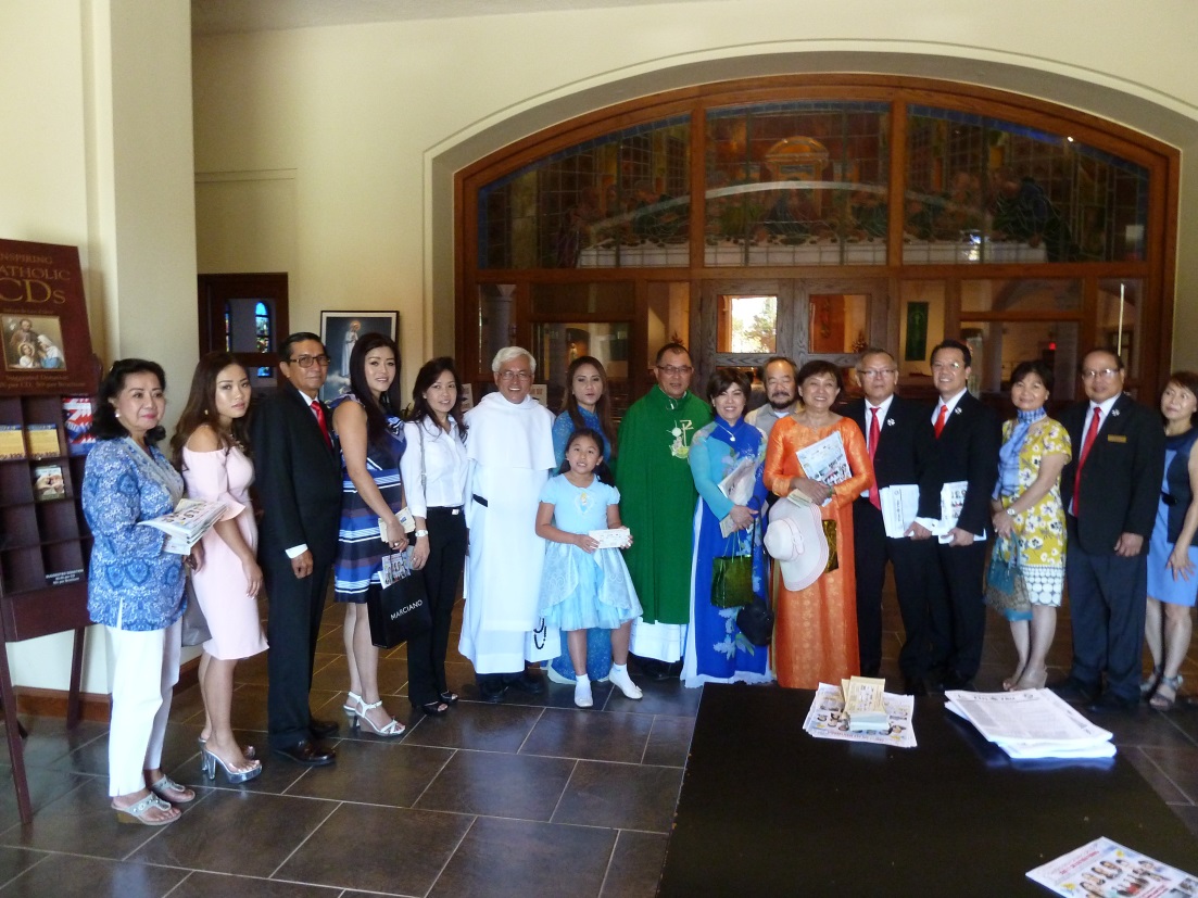 Người mặc áo lễ trắng bên trái là LM. Đinh Ngọc Thảo, Cha chánh xứ Đức Mẹ Lộ Đức, chụp hình kỷ niệm chung với LM. Michael Hoàng Nam (áo lễ xanh), LM. Cố vấn và Nhóm JFFV và thiện nguyện viên trong buổi bán vé số giúp nạn nhân Formosa vào trung tuần tháng 8 vừa qua. Hình JFFV.