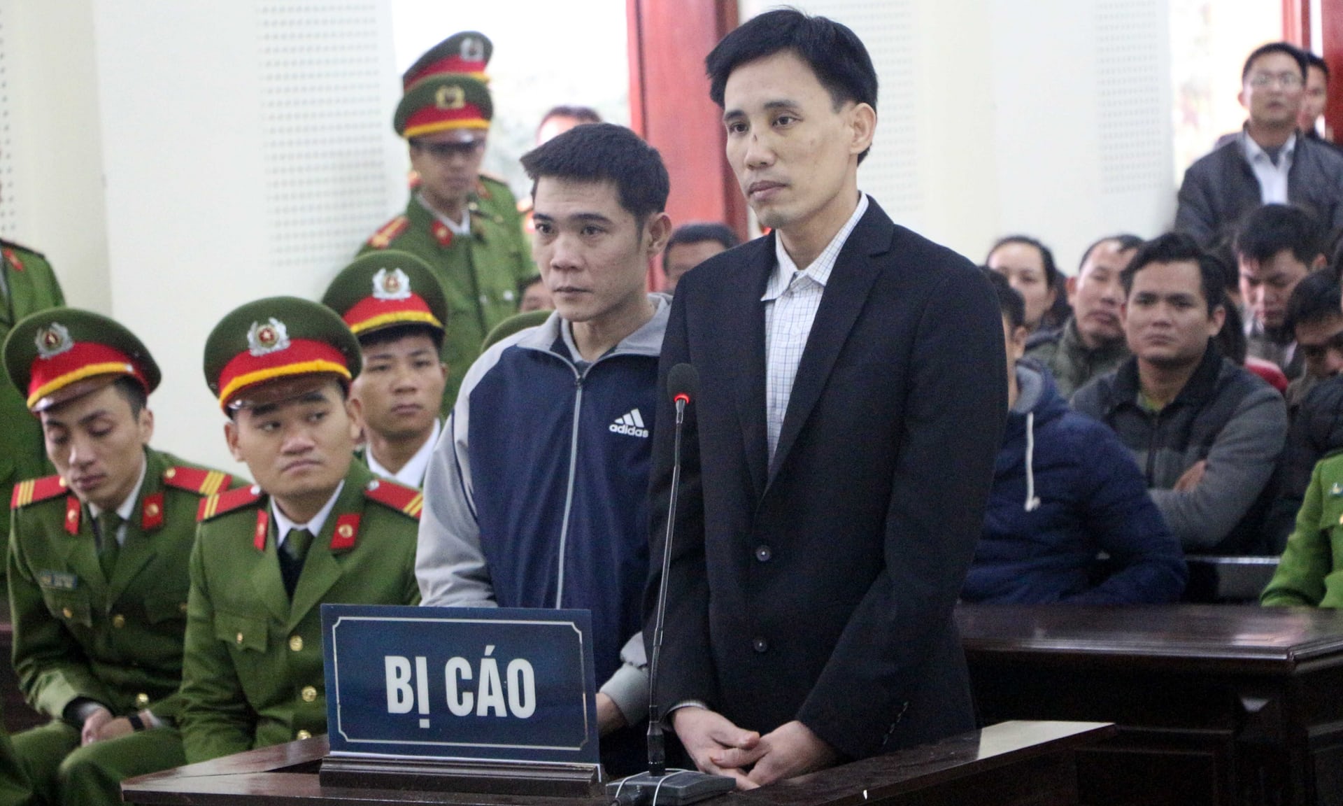 HDB01 Published March 4, 2018 at 1920 × 1152 in Vietnam jails activist for 14 years for livestreaming pollution march Anh Hoàng Đức Bình, giửa bên phải, và anh Nguyễn Nam Phong, giữa bên trái, tại tòa án tỉnh Nghệ An hôm 6/2/2018 2/2018: Hoang Duc Binh had posted footage on Facebook of fishermen protesting following a huge chemical spill from a steel plant