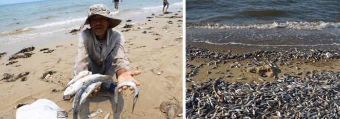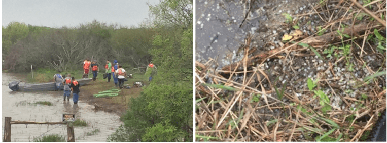 Hình trái: Người dân trong vùng vịnh Lavaca đi khảo sát. Hình phải: Đất và nước đều có những hạt nhựa pellets bám đầy gây ô nhiễm gần 30 năm qua.
