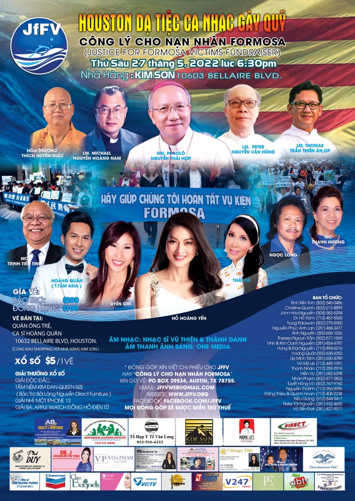 Để giúp các nạn nhân đủ kinh phí hoàn tất vụ kiện, Hội JFFV sẽ tổ chức một tiệc gây quỹ tại nhà hàng Kim Sơn, số 10603 Bellaire Blvd. Vào lúc 6 giờ 30 chiều Thứ Sáu 27 tháng 5 năm 2022, với sự chủ tọa của Đức Giám Mục Phaolô Nguyễn Thái Hợp đến từ Hà Tĩnh.