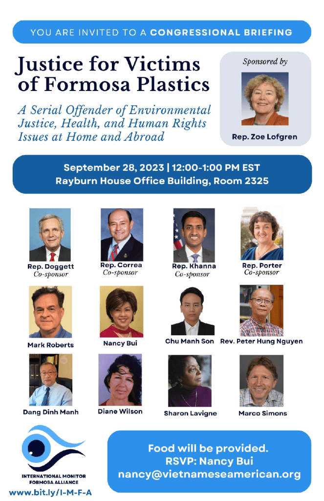 Để được sự quan tâm và hỗ trợ của các nhà lập pháp, chính giới, luật gia và dân chúng Hoa kỳ, với sự bảo trợ của nữ Dân biểu Zoe Lofgren, địa hạt Santa Clara, San Jose’ và đồng bảo trợ của một số dân biểu quốc hội Hoa Kỳ, Hội Công Lý Cho Nạn Nhân Formosa (JFFV) cùng Liên Minh Quốc Tế Giám Sát Formosa IMFA (International Monitor Formosa Alliance) với sự hỗ trợ của Cộng Đồng Người Việt Quốc Gia Liên Bang Hoa Kỳ và đặc biệt của Cộng Đồng Việt Nam Vùng Washington, D.C; Maryland & Virginia, sẽ tổ chức một buổi gặp gỡ, vận động các nhà Lập pháp Hoa Kỳ từ lúc 12 giờ trưa tới 1 giờ chiều tại phòng số 2325 trong tòa nhà Quốc Hội Rayburn, Hoa Thịnh Đốn, để trình bày về những vi phạm môi trường và nhân quyền đối với ngư dân miền trung Việt Nam của công ty Formosa và nhà nước Việt Nam trong thảm họa môi trường lớn nhất lịch sử Việt Nam năm 2016.
