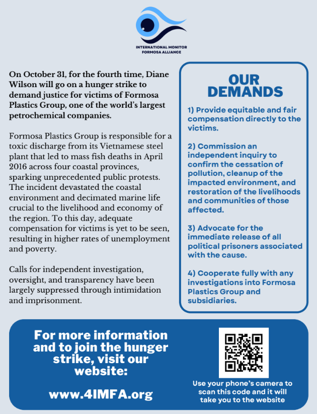 Sau buổi vận động cho nạn nhân thảm họa môi trường Formosa thành công tại Quốc Hội Hoa Kỳ, được sự hỗ trợ của Cộng Đồng Người Việt Quốc Gia Houston và vùng phụ cận, để tiếp tục tạo áp lực cho công ty Formosa phải giải quyết thỏa đáng cho các nạn nhân vì thảm họa do họ gây ra đã hơn 7 năm qua, Hội Công Lý Cho Nạn Nhân Formosa JFFV và Liên Minh Quốc Tế Giám Sát Formosa IMFA đang chuẩn bị cho cuộc Tuyệt Thực Toàn Cầu đúng vào ngày Halloween 31 tháng 10, 2023 vào lúc 2 giờ chiều, trước nhà máy Formosa tại số 201 Formosa Dr. Point Comfort, TX.77978.