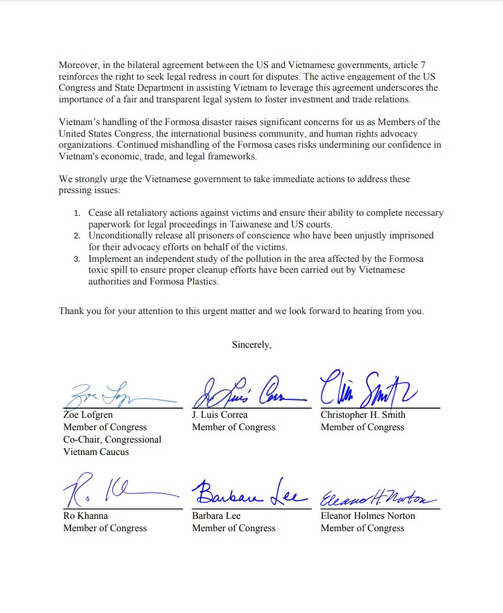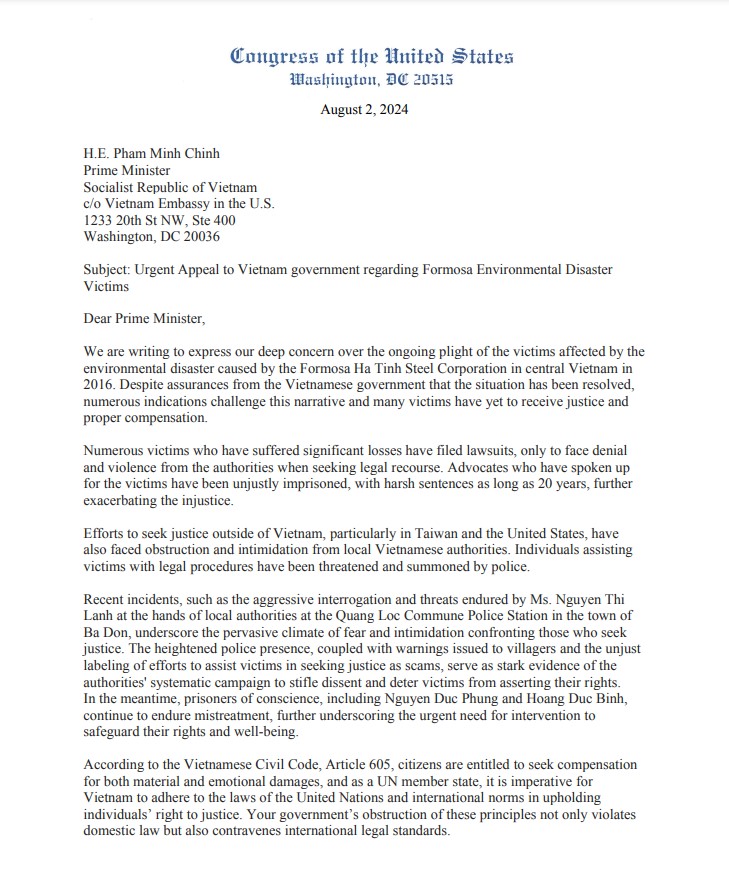 US Congress: Urgent Appeal to Vietnam government regarding Formosa Environmental DisasterVictims jffv02 / October 28, 2024 Share this: Click to share on X (Opens in new window) X Click to share on Facebook (Opens in new window) Facebook Like Loading...